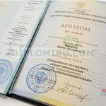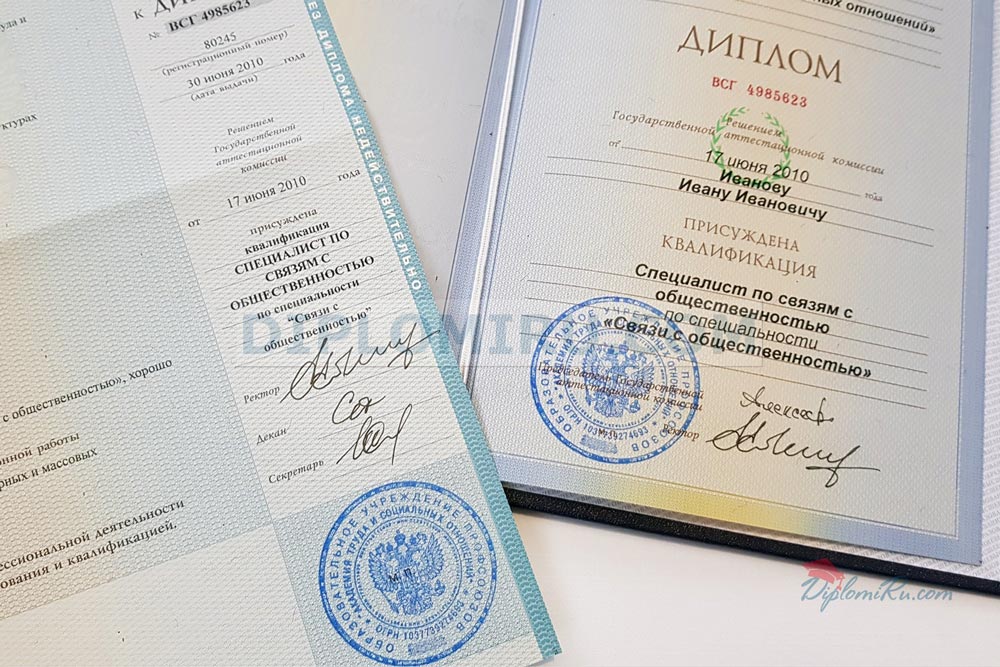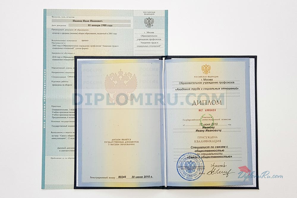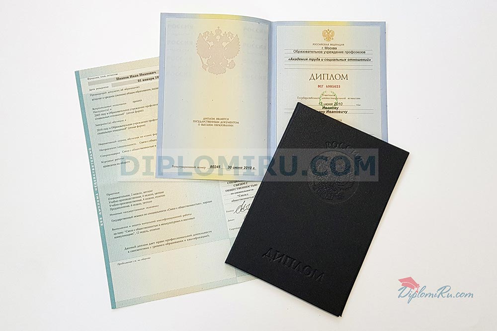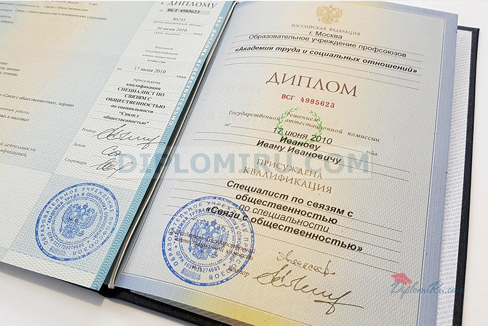 Диплом об окончании ВУЗа в 2010, 2011 годах. Нумерация бланка состоит из 2-х букв и 7-ти цифр. В работе используем только настоящие защищённые бумаги, заполняем как по стандартам Министерства образования России, так и по образцам документов, реально выданных тем или иным учебным заведением. На фото выше представлены заполненные корочки - точная копия оригинального диплома, выданного одним из Московских университетов.