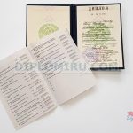 У нас Вы можете купить настоящий диплом СССР старого образца о высшем образовании – это синяя книжечка, лицевая сторона которой имеет рельефный штамп: вверху – изображение государственного герба Советского Союза, в нижней части написано «Диплом». Бланк наклеен на внутреннюю область обложки; приблизительно на одном расстоянии между верхом и низом, по обе стороны нанесен советский Герб. В дипломе СССР старого образца слева указан текст на том языке, в какой республике СССР находился ВУЗ, справа – русскоязычный текст. Для ВУЗов РСФСР слева располагается чистая зона, а напечатанные слова располагаются справа. В дополнение к диплому прилагается выписка из специальной зачетной ведомости.
