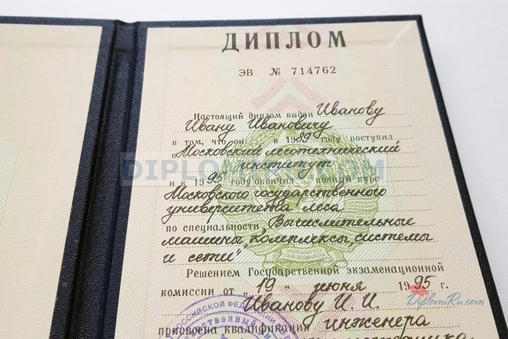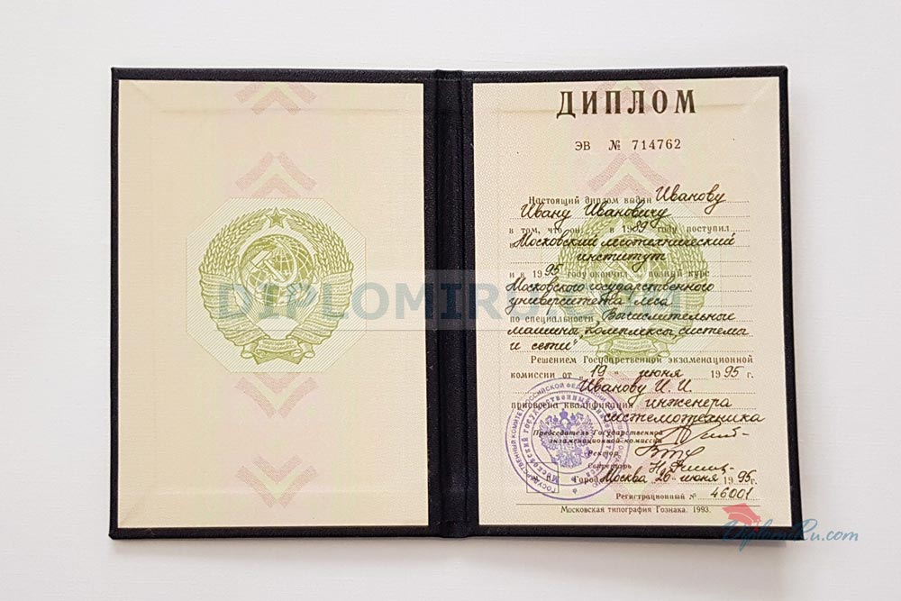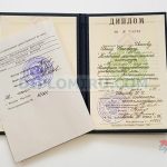 Официальный диплом СССР образца об окончании ВУЗа аккуратно заполняется чернилами вручную квалифицированными каллиграфами. Образцы, выданные до 1993 г. имеют гербовую печать с изображением советской символики, на дипломах, изготовленных с 1993 по 1996 гг. имеется гербовая печать России. Узнайте больше о том, как заполняются дипломы старого образца СССР в соответствии с государственными стандартами.